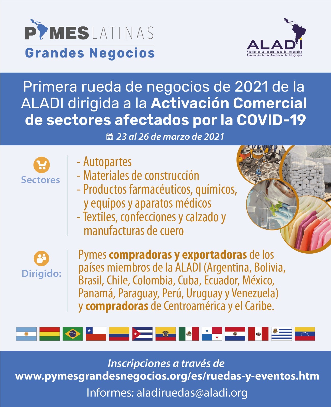 Queremos invitar a todas las PyMEs de la provincia de Buenos Aires, a participar de la Rueda Activación Comercial dirigida a sectores afectados por la COVID-19 organizada por la ALADI (Asociación Latinoamericana de integración). La ALADI tiene, entre sus objetivos, la promoción del comercio regional para lograr una mayor inclusión de las PyMEs en dicho comercio.